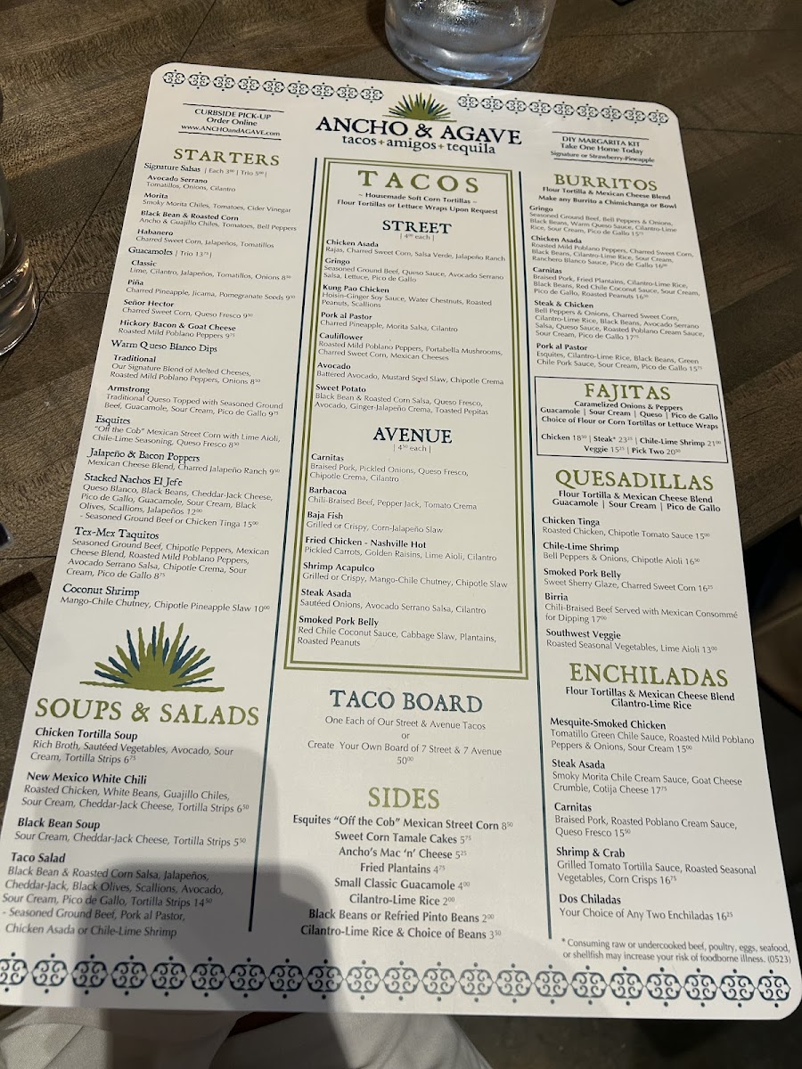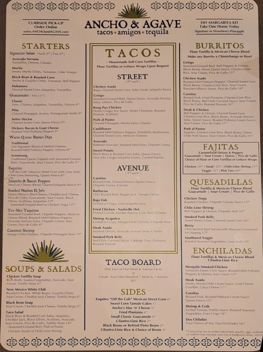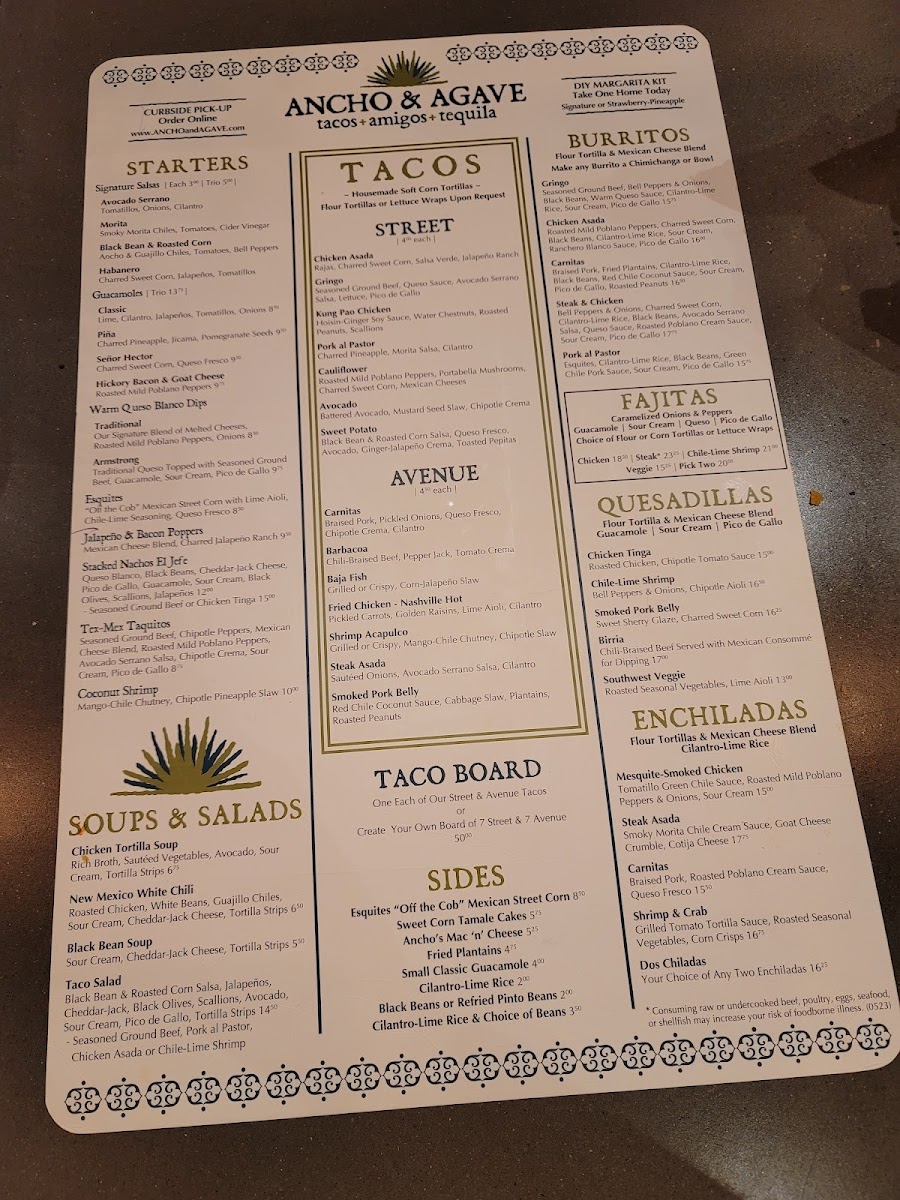 The attentive service enhances the experience, with patrons appreciating not just the delicious food but also the inviting atmosphere. Many recommend starting with the fire-roasted chips and salsa, a true standout. And don't forget to save room for dessert – the flan comes highly praised! Pair your meal with premium offerings from their impressive drink menu, including various anejos and white wines. Ancho & Agave is not just a meal; it’s an experience that promises to delight.